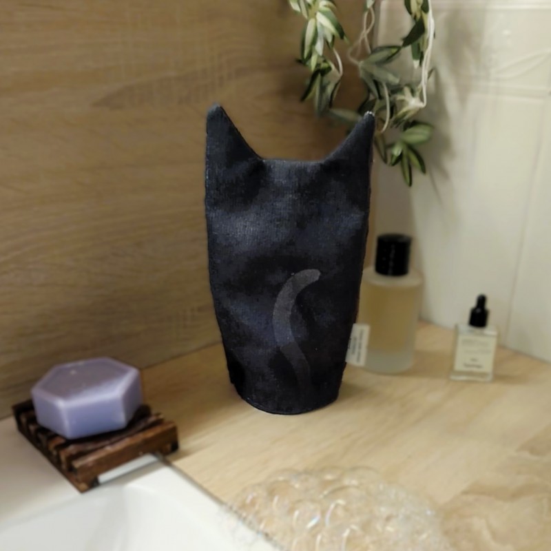 Offrez un moment de douceur avec ce gant de toilette en forme de chat noir, imaginé et fabriqué à la main dans l’atelier Forêt Câline.