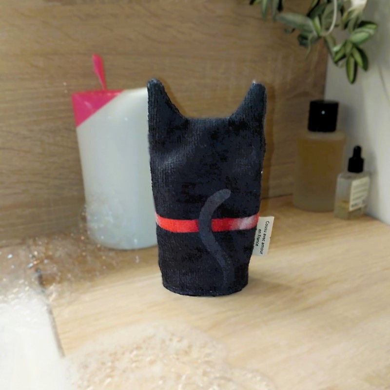 Offrez un moment de douceur et de jeu à l’heure du bain avec ce gant de toilette en forme de chat noir édition Noël, imaginé et fabriqué à la main dans l’atelier Forêt Câline.